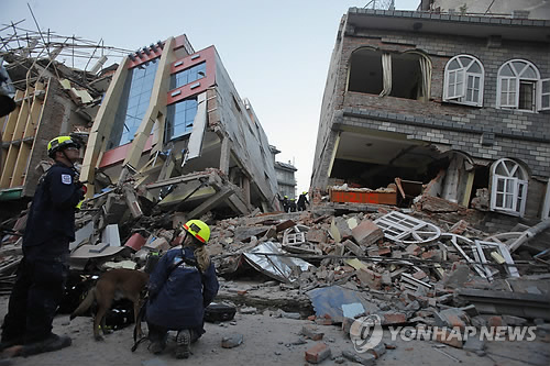 | △ 지난 13일(현지시간) 네팔 수도 카트만두의 지진 피해 현장에서 미 국제개발처(USAID) 구조대원들이 무너진 건물들을 살펴보고 있다. (AP=연합뉴스 자료사진) |
