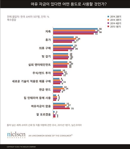 이와 동시에 여유자금을 저축에 쓰겠다는 답변(복수응답)은 56%에서 51%로 5%포인트, 여행·휴가에 쓰겠다는 응답은 27%에서 24%로 3%포인트, 옷을 사는 데 쓰겠다는 답은 26%에서 19%로 7%포인트 줄었다.