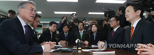 | △ 지방자치단체들이 속속 생활임금제를 도입하는 가운데 이를 둘러싼 찬반도 거세다. 사진은 3월 경기도 수원 경기도청을 방문한 새정치민주연합 문재인 대표(왼쪽)가 남경필 경기도지사와 만나 경기도 연정과 생활임금제에 대해 이야기를 나누는 모습이다. |