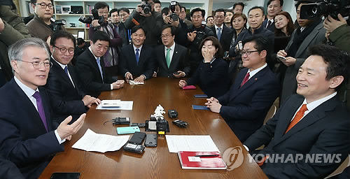 | △ 지방자치단체들이 속속 생활임금제를 도입하는 가운데 이를 둘러싼 찬반도 거세다. 사진은 3월 경기도 수원 경기도청을 방문한 새정치민주연합 문재인 대표(왼쪽)가 남경필 경기도지사와 만나 경기도 연정과 생활임금제에 대해 이야기를 나누는 모습이다. |