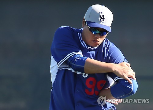 | △ 지난 3월 미국 애리조나 글렌데일에서 열린 다저스 스프링 캠프에서 어깨를 만지며 준비운동을 하는 류현진. (연합뉴스 자료사진) |