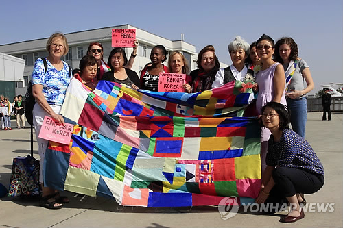 | △ '위민크로스DMZ' 평양 도착 (평양 AP=연합뉴스) 판문점을 통해 남북 비무장지대(DMZ)를 통과하기를 희망하고 있는 세계 여성평화운동단체 '위민크로스디엠지'(WCD) 회원들이 19일(현지시간) 평양 국제공항에 도착, 색동천을 앞세우며 기념촬영을 하고 있다. 가운데 영문 '한국 통일' 문구의 핑크빛 종이를 든 사람은 반전 단체 '코드 핑크' 공동 설립자 메디어 벤저민. |