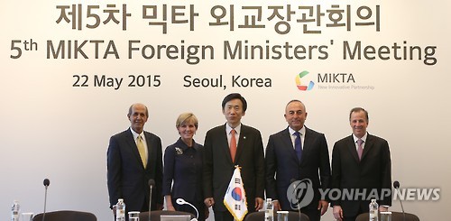 | △ 제5차 믹타 외교장관회의 개막 (서울=연합뉴스) 황광모 기자 = 윤병세 외교부 장관이 22일 오전 서울 장충동 신라호텔에서 개막된 제5차 믹타(MIKTA) 외교장관회의에서 회의 참가국 외교장관들과 기념촬영을 하고 있다. 사진 왼쪽부터 , 하산 클레이브 인도네시아 외교장관 특사, 줄리 비숍 호주 외교장관, 윤병세 장관, 메블륫 차부시오울루 터키 외교장관, 호세 안토니오 믿 멕시코 외교장관. hkmpooh@yna.co.kr |