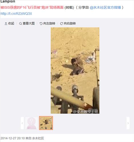 실제로 중국의 일부 누리꾼에 의해 이 동영상은 지난해 12월 27일 웨이보에 'IS의 F16 전투기 조종사 처형'이라는 제목으로 올라왔던 것으로 확인됐다.