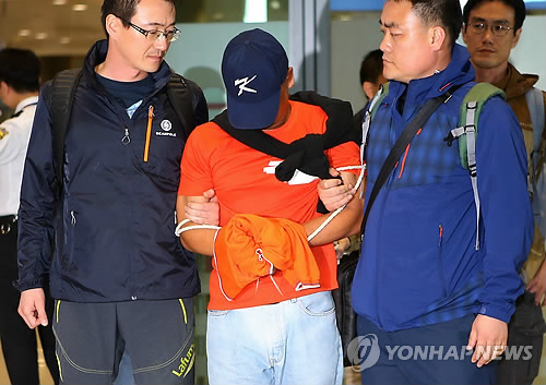 | △ 국내송환된 '안양 환전소 살인사건' 피의자 (영종도=연합뉴스) 최수향 기자 = '안양 환전소 살인사건' 피의자 김성곤씨가 지난 13일 오후 인천공항을 통해 압송되고 있다. 김씨는 국내에서 살인을 저지르고 필리핀으로 도주했다 8년만에 국내로 송환됐다. |
