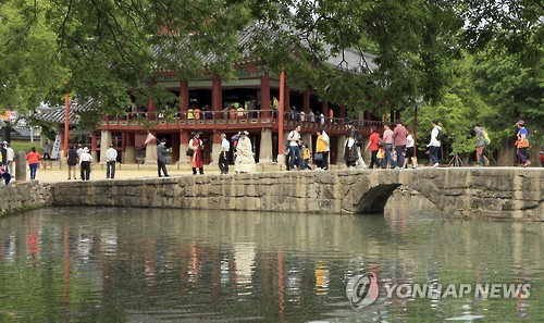 △ '춘향제 열기 속으로!' (남원=연합뉴스) 백도인 기자 = 제85회 춘향제가 개막한 22일 행사장인 남원 광한루원 앞의 오작교를 관광객들이 한가롭게 거닐고 있다. 25일까지 이어지는 올해 춘향제에서는 다양한 국악 공연과 함께 20여가지의 놀이와 체험, 문화 행사가 진행된다. 2015.5.22 doin100@yna.co.kr
