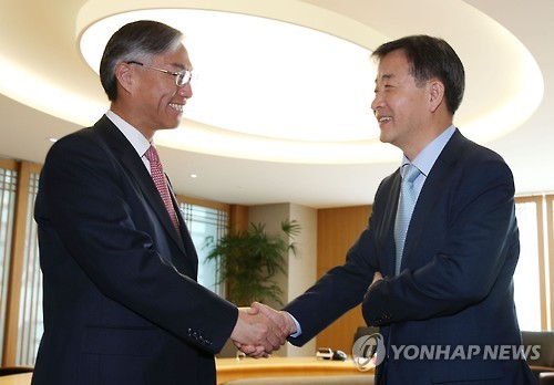 | △ 추궈홍 주한중국대사 연합뉴스 방문 (서울=연합뉴스) 추궈홍(邱國洪) 주한 중국대사(왼쪽)가 22일 서울 종로구 수송동 연합뉴스·연합뉴스TV 본사를 방문, 박노황 연합뉴스 사장과 인사하고 있다. |