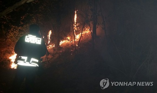 △ 대전 식장산 산불 (대전=연합뉴스) 22일 저녁 대전 동구 식장산 고산사 인근에서 불이 나 소방 관계자가 진화 작업을 하고 있다. 2015.5.22 << 독자 제공 >> walden@yna.co.kr