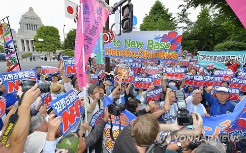 일본 시민단체 회원 등 약 1만5천명(주최 측 추산)은 이날 도쿄도(東京都) 지요다(千代田)구에서 국회 건물을 둘러싸고 기지 이전 반대 시위를 벌였다.