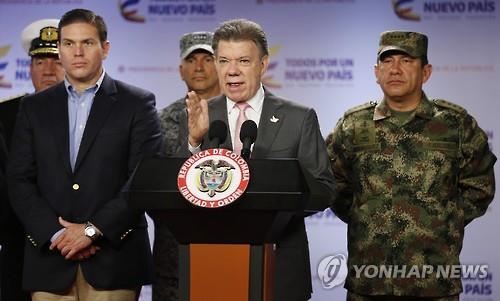 △ 후안 마누엘 산토스 콜롬비아 대통령이 지난 21일(현지시간) 최대 반군인 콜롬비아무장혁명군(FARC)의 캠프를 공습한 뒤 성명을 발표하고 있다.(AP=연합뉴스DB)