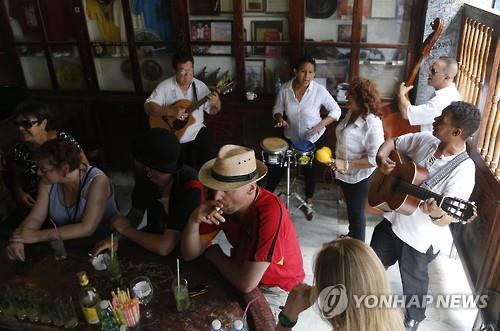 △ 24일(현지시간) 쿠바 아바나를 찾은 관광객들이 노벨문학상 작가 어니스트 헤밍웨이가 즐겨찾았던 바에서 모히토 등 음료를 즐기고 있다.(AP=연합뉴스)