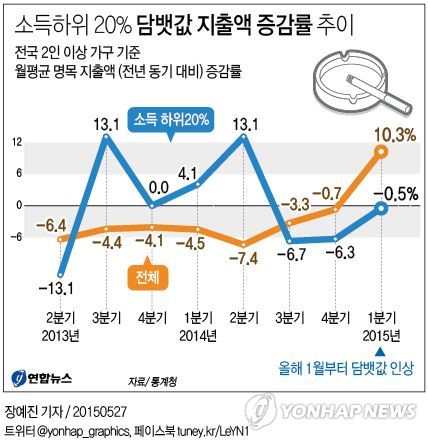 △ <그래픽> 소득하위 20% 담뱃값 지출액 증감률 추이 (서울=연합뉴스) 장예진 기자 = 27일 통계청의 가계동향 자료에 따르면 올 1분기에 전국 2인 이상 가구가 담배를 사는 데 들인 월평균 명목 지출액은 1만7천855원으로 지난해 같은 기간(1만6천184원)보다 10.3% 증가했다. jin34@yna.co.kr 페이스북 tuney.kr/LeYN1 트위터 @yonhap_graphics