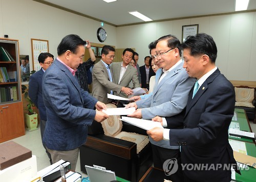 | △ 사퇴서 제출하는 새정치연합 소속 의원 (청주=연합뉴스) 새누리당의 새 상징마크(CI) 단독 처리에 반발한 새정치연합 소속 시의원들이 27일 청주시 의회사무국에 사퇴서를 제출하고 있다. 2015.5.27 <<청주시의회>> jcpark@yna.co.kr |