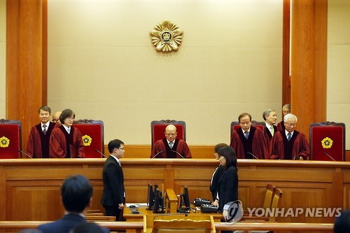 △ 대심판정 들어서는 박한철 소장 (서울=연합뉴스) 박동주 기자 = 박한철 헌법재판소장이 28일 오후 전교조를 법외노조로 판정한 근거인 교원의 노동조합 설립 및 운영에 관한 법률에 관해 서울고법이 제청한 위헌법률심판 사건 선고를 위해 서울 헌법재판소 대심판정으로 들어서고 있다.