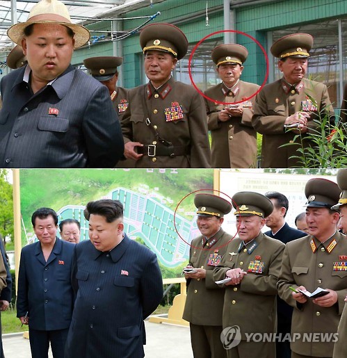| △ 이날 노동신문에 실린 사진에는 김정은 국방위원회 제1위원장의 군 산하 종합양묘장 건설 공사 시찰 현장에서 박영식 부국장이 별 4개가 달린 대장 견장을 단 모습이 포착됐다(위). 박영식 부국장은 지난 15일 김정은 제1위원장의 제810군부대 산하 신창양어장 방문 당시 사진(아래)에서는 견장의 별이 3개였다. 2015.5.29 |