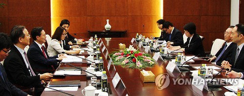 | △ 한미일 '대북제재 강화' 한 목소리…중국은 '요지부동' (베이징=연합뉴스) 이준삼 특파원 = 중국을 방문 중인 우리 측 6자회담 수석대표인 황준국 외교부 한반도평화교섭본부장이 지난 28일 오후 베이징(北京)에서 우다웨이(武大偉)한반도사무특별대표와 만나 회담하고 있다. << 주중 한국대사관 제공 >> jslee@yna.co.kr |