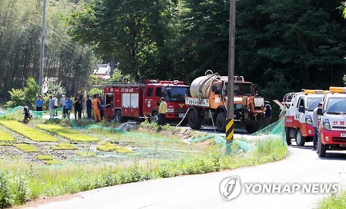 | △ "모내기 못한 논에 농업용수 공급 작전" (강릉=연합뉴스) 유형재 기자 = 극심한 봄 가뭄이 계속된 가운데 31일 가뭄으로 모내기하지 못한 강릉시 난곡동의 한 논에서 시와 소방서, 기업체 등이 민·관 합동으로 농업용수를 공급하고 있다. 2015.5.31 yoo21@yna.co.kr |