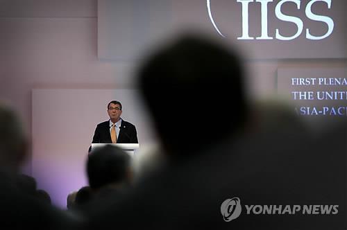| △ (싱가포르 AP=연합뉴스) 30일 싱가포르의 제 14차 아시아안보회의(일명 샹그릴라 대화)에서 애슈턴 카터 미국 국방장관이 '아시아태평양 안보 도전과 미국' 주제의 제 1본회의에서 연설하고 있다. |