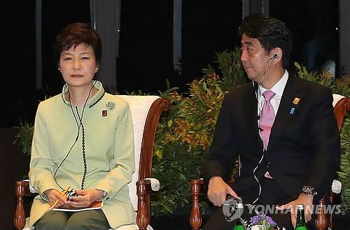 △ 2013년 10월 7일(현지시간) 인도네시아 발리 쏘피아 호텔에서 열린 APEC 기업인자문위원회와의 대화에서 아베 신조 일본 총리가 박근혜 대통령을 바라보고 있다. (연합뉴스 자료사진)