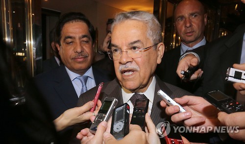 | △ Saudi Arabia's Minister of Petroleum and Mineral Resources Ali Ibrahim Naimi speaks to journalists at a hotel in Vienna, Austria, Monday, June 1, 2015. (AP Photo/Ronald Zak) |