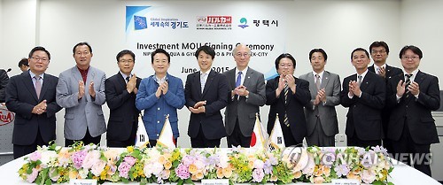 △ 일본 발카공업, 평택에 추가 투자협약식 (수원=연합뉴스) 2일 오후 발카코리아 평택공장에서 열린 '발카공업(주) 추가투자 협약식'에 참석한 남경필 경기도지사와 타키사와 발카코리아 사장 등 관계자들이 협약서에 서명하고 나서 기념촬영을 하고 있다.2015.6.2 <<경기도 제공>> hedgehog@yna.co.kr