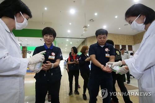△ 손 소독 실시하는 대형마트 직원들 (서울=연합뉴스) 양지웅 기자 = 중동호흡기증후군(메르스) 환자가 연일 늘어나고 있는 2일 서울의 한 대형마트에서 직원들이 손 소독을 실시하고 있다. 2015.6.2 yangdoo@yna.co.kr