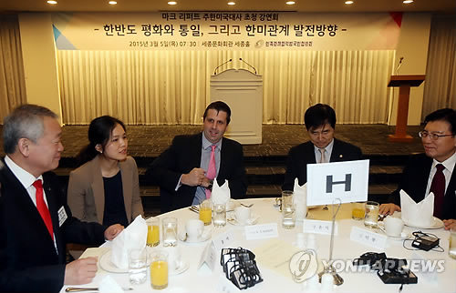| △ 마크 리퍼트 주한 미대사(왼쪽 세번째)가 지난 3월 5일 오전 세종문화회관 세종홀에서 열린 민족화해협력범국민협의회 주최 초청 강연회에서 새누리당 장윤석 의원 등 참석자들과 환담하고 있다. |