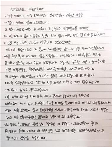 예원은 "이 글을 쓰기까지 오랜 시간이 걸려 죄송한 마음을 어떻게 전해야 할지 모르겠다"며 "당시 처음 겪어보는 큰 여론에 독단적으로 입장 발표를 하기에는 많은 사람의 입장이 있어 쉽게 어떤 말도 할 수가 없었다"고 편지를 쓴 이유를 설명했다.