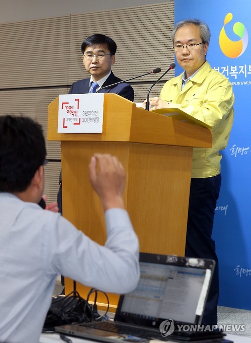 △ 메르스 상황 브리핑 (세종=연합뉴스) 배재만 기자 = 중앙메르스관리대책본부 기획총괄반장인 권준욱 보건복지부 공공보건정책관이 3일 오전 정부세종청사 공용브리핑룸에서 열린 정례브리핑에서 취재진의 질문에 답하고 있다. 왼쪽은 김우주 대한감염학회 이사장.