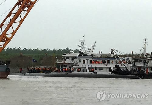 | △ 양쯔강 침몰 유람선 구조작업 '제자리걸음' (젠리현<中 후베이성> AP=연합뉴스) 중국 양쯔강 중류 후베이성 젠리현 부근에서 유람선이 침몰한 지 사흘째인 3일(현지시간) 선체에 올라간 구조대원들이 작업을 벌이고 있다. 중국 당국이 수색작업을 가속하며 인명 구조에 총력을 기울이고 있지만 좀처럼 희소식은 들려오지 않고 있다. 현재까지 14명만이 구조됐으며 18구의 시신이 수습, 458명 탑승자 중 약 430명의 생사가 여전히 불투명한 상태다. 2010596@yna.co.kr |