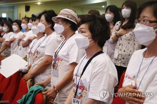 △ (서울=연합뉴스) 이상학 기자 = 중동호흡기증후군(메르스)에 대한 공포가 사회 전반으로 퍼지고 있는 가운데 3일 오후 서울 광진구 세종대학교 대양홀에서 열린 (사)한국여성인력개발센터연합 10주년 행사 '여성이 먼저 합니다'에서 참석자들이 마스크를 착용하고 국기에 대한 경례를 하고 있다. 2015.6.3 leesh@yna.co.kr