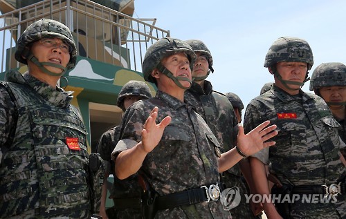 | △ 만반의 전투태세 강조하는 최윤희 합참의장 (연평도 사진공동취재단=연합뉴스) 최윤희 합참의장(가운데)이 4일 서해 최북단 해병대 연평부대를 방문해 293전탐감시대에서 발언을 하고 있다. 최윤희 합참의장은 이날 시찰에서 북한군의 기습 도발에 대비한 만반의 전투태세를 지시했다. 2015.6.4 photo@yna.co.kr |