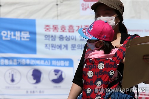 △ '메르스 조심' (서울=연합뉴스) 박지호 기자 = 3일 오전 연건동 서울대학교병원 응급실 입구에 설치된 메르스 의심환자 격리센터(의심증상 검사 및 임시 수용시설) 앞에서 한 시민이 마스크를 쓴 채 아이를 안고 어린이병동으로 걸어가고 있다. 2015.6.3 jihopark@yna.co.kr