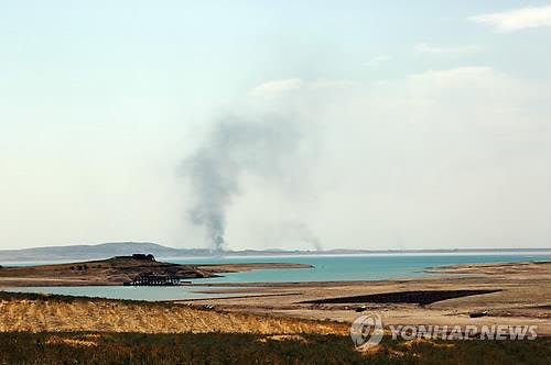 △ 수니파 무장조직 '이슬람국가'(IS)가 이라크 라마디 인근 댐의 수문을 차단해 유프라테스강 유량이 줄어들면서 하류에 있는 정부군 측 지역의 물 부족이 현실화하고 있다. 사진은 지난해 8월 미군과 이라크군의 탈환작전 과정에서 미군의 공습으로 연기가 치솟고 있는 모술댐 모습. 2015.6.5 (AP=연합뉴스DB)