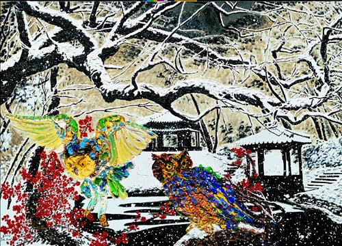 봄과 겨울이 함께 보이는 듯한 풍경에 자리 잡은 두 부엉이는 새로운 시작에서 '길상'을 의미하는 것으로 읽힌다.