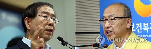 | △ 문형표 장관 vs 박원순 시장 (세종 서울=연합뉴스) 배재만 신준희 기자 = 문형표 보건복지부 장관이 5일 서울시가 전날 중동호흡기증후군(메르스) 의심 의사가 최소 1천500여명 접촉했다고 발표한 것과 관련해 강한 유감을 표명했다. 오른쪽은 이날 정부세종청사에서 브리핑하는 문형표 보건복지부 장관, 왼쪽은 4일 서울시청 브리핑룸에서 메르스 관련 긴급 브리핑하는 박원순 서울시장. |