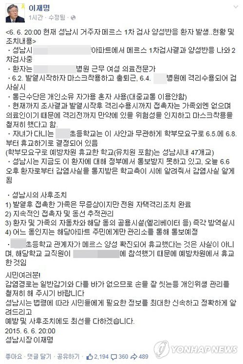 △ '메르스 정보 공개' 이재명 성남시장 페이스북 (성남=연합뉴스) 이재명 성남시장이 메르스 양성 판정을 받은 사람의 직업과 거주지, 자녀가 다니는 학교 실명을 6일 공개했다. 이 시장은 이날 오후 8시 10분께 자신의 페이스북에 메르스 사태와 관련한 성남시 조치 내용을 알리는 '<6.6 20:00 현재 성남시 거주자 메르스 1차 검사 양성반응 환자 발생..현황 및 조치내용>'이라는 글을 올렸다. 사진은 페이스북 캡쳐. 실명은 보도과정 중 익명처리. 2015.6.6 << 이재명 성남시장 페이스북 캡쳐 >> you@yna.co.kr