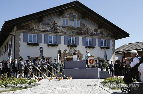 | △ 이 알프스 산록 '바이에른'에서… (크륀<독일> AP=연합뉴스) 주요 7개국(G7) 정상회의 참석차 독일에 온 버락 오바마(오른쪽 2번째) 미국 대통령이 7일(현지시간) 바이에른주 가미슈-파르텐키르헨 부근 크륀 읍사무소 앞에서 즉석 연설을 하고 있다. 그 오른쪽에 앙겔라 메르켈 독일 총리가 서 있다. 오바마 대통령과 메르켈 총리는 이날 G7 회의에 앞서 우크라이나 사태와 시리아 및 이라크내 이슬람국가(IS) 격퇴 공조 방안, 미국과 EU간 자유무역협정 등 지구적 현안을 논의한다. bulls@yna.co.kr |