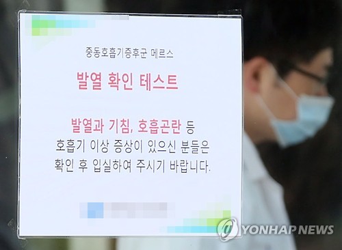 | △ "발열 증세 있으면 메르스 의심하세요" (부천=연합뉴스) 윤태현 기자 = 중동호흡기증후군(메르스)이 수도권을 중심으로 확산하는 가운데 7일 오후 경기도 부천시의 한 대형병원 응급실에 발열 확인을 권고하는 안내장이 붙어 있다. tomatoyoon@yna.co.kr |