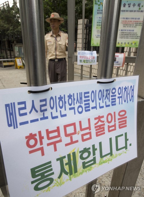 | △ '학부모님 출입 통제합니다' (서울=연합뉴스) 윤동진 기자 = 중동호흡기증후군(메르스) 확산이 계속되고 있는 8일 오전 서울 서대문구 미동초등학교 정문에 학부모들의 출입을 통제한다는 문구가 적힌 종이가 붙어 있다. 서울시교육청은 강남구와 서초구의 유치원 69개, 초등학교 57개 등 126곳이 이날부터 10일까지 일괄휴업한다고 밝히면서 이외 정상적으로 운영되는 학교에게 등교한 학생 전체에 대해 매일같이 발열체크를 할 것을 당부했다. 2015.6.8 mon@yna.co.kr |