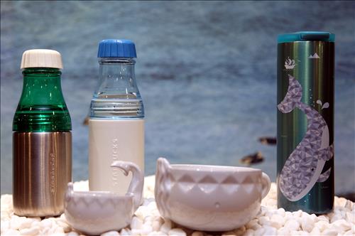 '2015 SS 서머 트로이 고래 텀블러'(473㎖, 3만3천원)는 앞면에 기하학 패턴의 고래가, 뒷면에는 사이렌이 그려졌다.