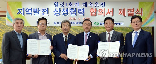 △ 월성원전 1호기 계속운전 합의안 타결 (경주=연합뉴스) 한국수력원자력과 경주시, 월성원전 1호기 동경주대책위원회는 8일 경주시청에서 월성 1호기 계속운전 관련 지역상생방안에 대한 3자 합의안에 공동 서명했다. 한수원은 이로써 지난 2012년 11월 운영을 멈춘 월성 1호기 재가동을 위한 주민수용성과 상생 기반을 확보함에 따라 월성 1호기 가동준비에 박차를 가할 계획이다. 사진은 조석 한국수력원자력 사장, 최양식 경주시장, 이판보·신수철 동경주대책위원회 공동대표 등이 합의안에 서명한 뒤 기념촬영을 하는 모습. 2015.6.8 << 월성원전 >> haru@yna.co.kr