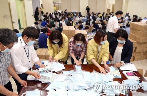| △ (부산=연합뉴스) 조정호 기자 = 부산에서도 첫 메르스 확진자 1명이 발생한 가운데 기장군 공무원들이 8일 오후 군청 강당에서 방역마스크를 포장하고 있다. 기장군은 긴급 예비비를 사용해 마스크 75만장, 손세정제 1만1천개를 구입해 각 가정(인구 15만명)과 학교, 음식점, 마을경로당 등에 나눠 주고 있다. 2015.6.8 ccho@yna.co.kr |