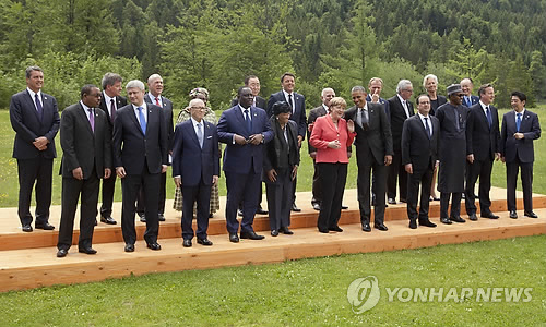 | △ G7 정상회의 폐막 (엘마우<독일> AP=연합뉴스) 주요 7개국(G7) 정상들과 주요 국제기구 수장 등이 독일 가르미슈-파르텐키르헨 인근 성(城) 엘마우 호텔에서 G7 정상회의를 마무리 하며 기념 단체사진을 찍고 있다. 앙겔라 메르켈 독일 총리(앞줄 가운데·분홍 상의)가 옆에 서 있는 버락 오바마 대통령과 웃으며 얘기를 나누고 있다. marshal@yna.co.kr |