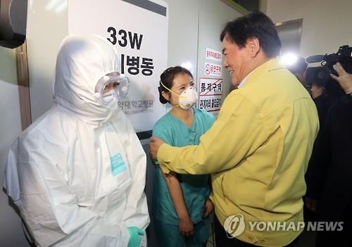 | △ 격리병실 의료진 포옹하는 최경환 총리대행 (대전=연합뉴스) 배재만 기자 = 최경환 국무총리 직무대행이 9일 오전 대전 건양대학교병원을 방문, 격리병실 입구에서 메르스 격리환자들을 치료중인 의료진을 포옹하며 격려하고 있다. |