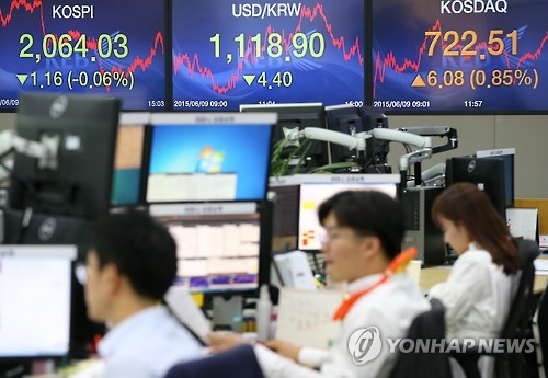 △ '코스닥은 올랐지만' (서울=연합뉴스) 한종찬 기자 = 코스닥 지수가 9일 나흘째 상승 랠리를 이어가며 7년 6개월 만에 720선을 돌파했다. 코스닥 지수는 전날보다 6.08포인트(0.85%) 오른 722.51에 마감했다. 코스닥 지수가 720선을 넘은 것은 종가 기준으로 지난 2007년 12월 14일 725.53을 기록한 이후 7년 6개월 만이다. 반면 미국 금리 인상 우려와 중동호흡기증후군(메르스) 등 대내외 악재에 둘러싸인 코스피는 사흘째 약세를 보였다. 코스피는 전날보다 1.16포인트(0.06%) 내린 2,064.03에 마감했다. 사진은 이날 오후 서울 을지로 외환은행 본점 딜링룸.
