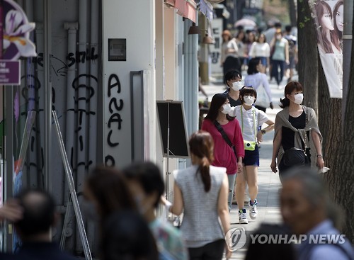 △ 마스크 착용한 관광객 (서울=연합뉴스) 윤동진 기자 = 중동호흡기증후군(메르스)이 확산돼고 있는 9일 오후 서울 강남구 신사동 가로수길에서 관광객들이 마스크를 쓴 채 걸어가고 있다.