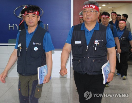 | △ 협상장 나오는 현대차 노조위원장 (울산=연합뉴스) 장영은 기자 = 이경훈 현대자동차 노조위원장(오른쪽)이 2일 울산공장 아반떼룸에서 열린 올해 임금과 단체협약 교섭을 위한 첫 상견례를 끝내고 협상장을 나오고 있다.2015.6.2 young@yna.co.kr |