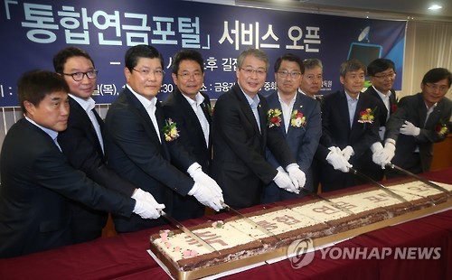 △ 연금통합포털 서비스 개시 (서울=연합뉴스) 황광모 기자 = 임종룡 금융위원장(왼쪽에서 다섯번째)과 한 내빈들이 11일 오전 서울 여의도 금융감독위원회에서 열린 통합연금포털 서비스 오픈식에서 홈페이지 개소를 축하하는 떡을 자르고 있다. (사진 왼쪽부터) 민성기 은행연합회 전무, 김학수 금융위원회 자본시장 국장, 차남규 한화생명 대표이사, 김병호 하나은행장, 임종룡 금융위원장, 진웅섭 금감원장, 홍성국 대우증권 대표이사, 이동엽 금감원 부위원장, 이은태 금감원 부위원장보, 권홍구 보험개발원 부원장.