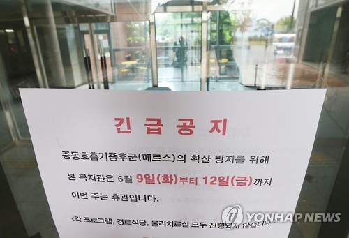 △ 메르스 우려에 휴관한 노인복지관 (부산=연합뉴스) 차근호 기자 = 11일 오후 부산시 사하구의 한 노인복지관이 중동호흡기증후군(메르스)에 대한 우려로 휴관에 들어가 썰렁한 모습을 보이고 있다. 2015.6.11 ready@yna.co.kr